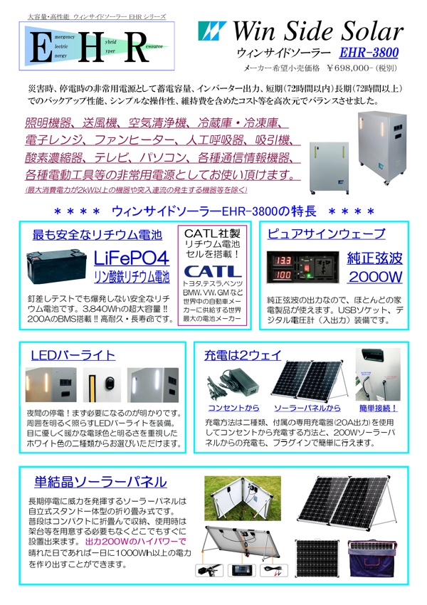 LEDライト、UPS(無停電装置)付き高出力インバーター・大容量バッテリーシステム